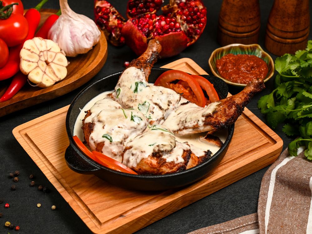 Цыпленок,сливки,сметана,чеснок,кинза,петрушка,масло растительное,соль,перец,кориандр