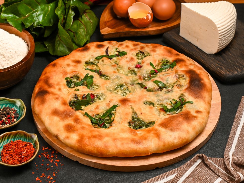 Дрожжевое тесто, листья свеклы, зеленый лук, кинза, укроп, грузинские специи, сыр сулугуни, сыр имеретинский, сливочное масло